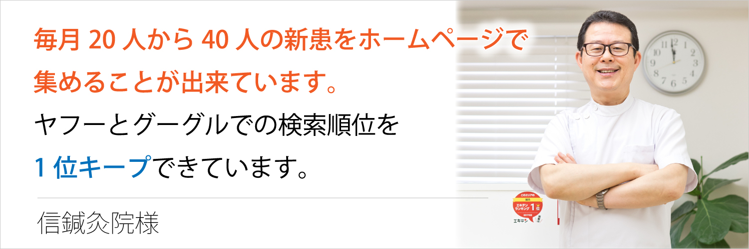 マンションの1室で鍼灸院を営んでいますが、ホームページを作成してから毎月20人~40人ほどネットで新規集客出来ています。